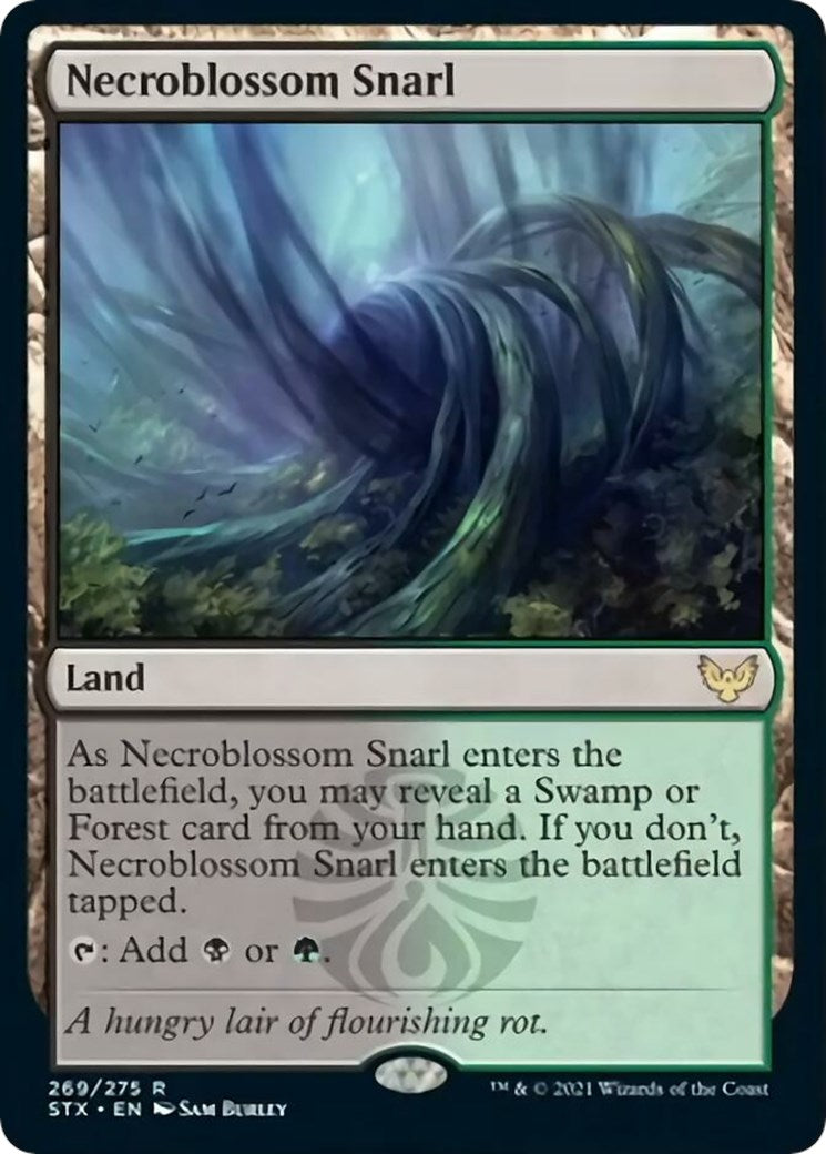 - Rules Text Contains: As Necroblossom Snarl enters the battlefield, you may reveal a Swamp or Forest card from your hand. If you don't, Necroblossom Snarl enters the battlefield tapped. <br>T: Add B or G.