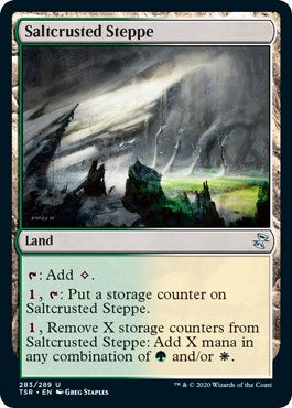 - Rules Text Contains: T: Add C. <br> 1, T: Put a storage counter on Saltcrusted Steppe. <br> 1, Remove X storage counters from Saltcrusted Steppe: Add X mana in any combination of G and/or W.